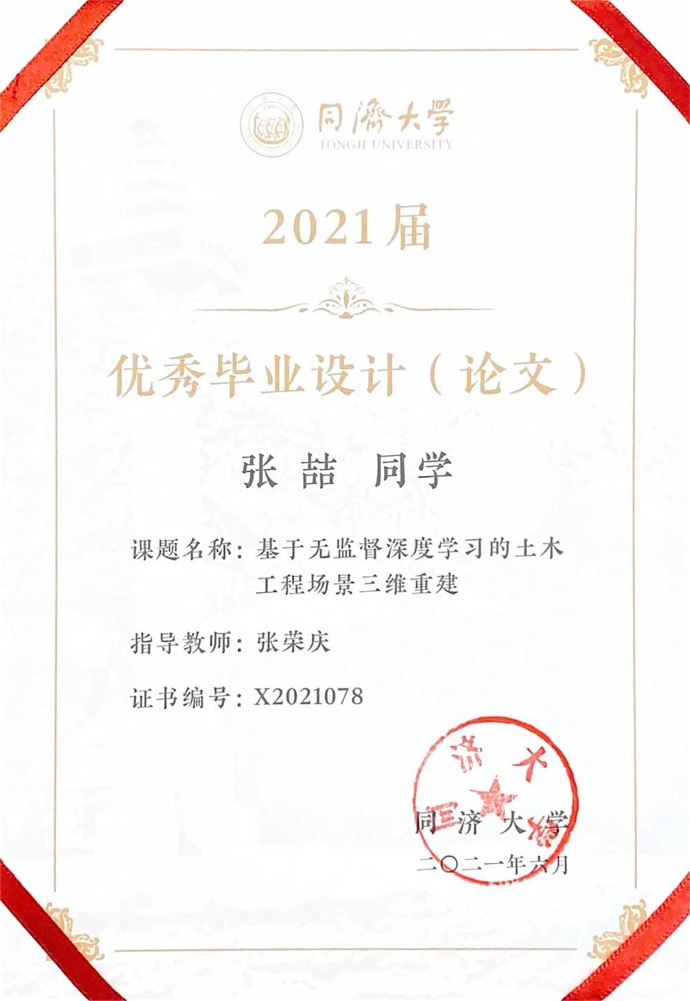 同济大学2021届本科毕业生;工学学士;上海市优秀毕业生;追求卓越学生奖获得者(校最高奖);GPA: 4.79/5.00,综合排名1st/212;第一届人工智能辅修唯一满绩结业
